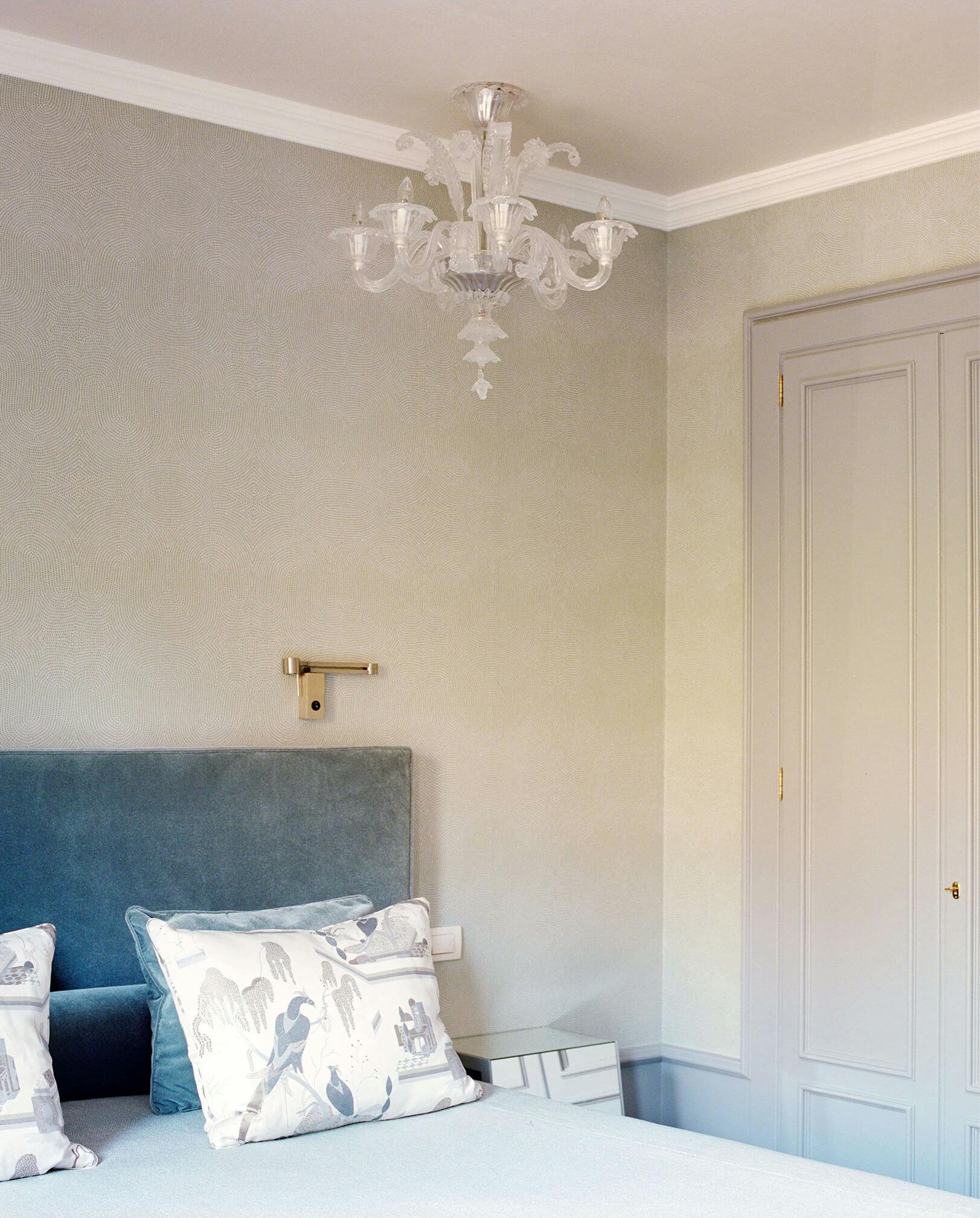 For the Room Maria Rita, the design began with the chandeliers, salvaged from another room also undergoing renovation. The semantic field evoked by the classic glass of such high-quality chandeliers inspired the entire room’s palette: vinyl wallpaper with aquatic motifs by Artewallcovering, bespoke nightstands with mirrored finishes, reflecting the mirrored corner by the fireplace, and finally, a fully handcrafted bed with Zimmer&Rohde upholstery, Dedar decorative cushions, and Treca de Paris mattresses.